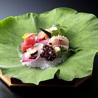 天然魚介類のお造り。仕入れる食材は全て天然もの。全国より活きで届く魚を選りすぐりで盛り合わせて提供しています。また野菜は、千葉県三里塚の契約農家さんより届く新鮮野菜を使用しています。神亀酒造をはじめとした全国の地酒は、常時80種以上の取り揃えがございます。季節のお料理とのマリアージュをご堪能ください。