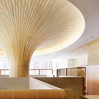 一日中お客様が集う空間であるよう、ダイニング、ラウンジ、バーという 3 つの機能を持たせました。「ロッシニ」伝統のカレーとローストビーフを基軸にした、カジュアルなメニューを展開し、若い世代にも気兼ねなくご利用いただける空間となります。皇居を望めるカフェスペースもご用意し、新生東京會舘のシンボル的存在となる店舗です。