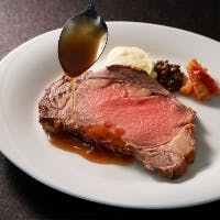 絶賛を頂戴し続ける美味しさと、ロゼピンクの美しさが光る「東京會舘ローストビーフ」は東京會舘のおもてなしを代表する逸品だと自負しています。 熟練の目と感覚で肉質を見極め、丁寧な下処理を施し、焼き加減は温度計を使わず、体で覚える。じっくり3時間かけて焼き上げた肉をさらに寝かせ、提供する際は野菜を使わず1週間煮込んで肉の旨味だけを閉じ込めたグレービーソースを添えて。 宴会でもレストランでも、お客様の目の前でカットするのが東京會舘流です。