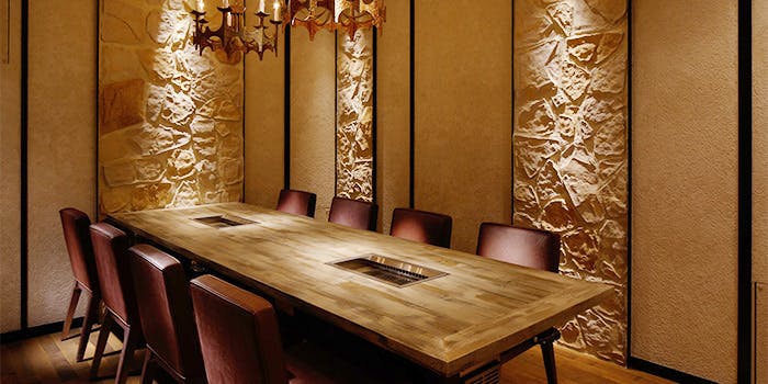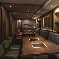 店内は、大人の街に相応しく、古材とアンティークのシャンデリアが基調です。焼肉店とは思えないカジュアルで広々とした空間に、自然と会話が弾みます。ロースターや設備にも徹底的にこだわっているため、髪や服にも匂いがつきません。大切な方との会食や親密な時を約束する個室は3部屋。職人の匠の技を感じるカウンター8席。賑わいで活気溢れるテーブル席58席。宴会やデートなどお客様のシーンに合わせて、様々なタイプの席をご用意しております。