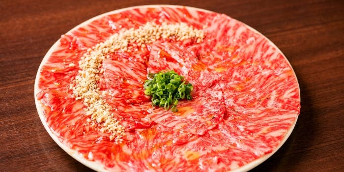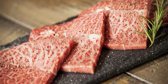 この道30年の肉職人が持つ目利きで厳選した金舌の黒毛和牛。仕入れるお肉はA4、A5ランク、刺しと肉質がキメ細かい雌牛と去勢牛のみ。雌牛は、筋肉が雄よりも少ない分、肉質がとてもやわらかくしっとりしています。脂肪には雑味もなく、融点が人肌と同じくらい低いのが最大の特徴。当店のスペシャリティは熟成 金舌。店名の通り、牛タンには一番のこだわりを持ち、旨みと香りにより深みを持たせるため、タンを吊るし30日間熟成させております。金舌はほんのり焦げ目がつくくらい焼いて、そのままお召し上がり下さい。