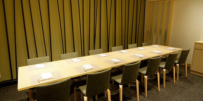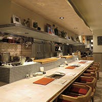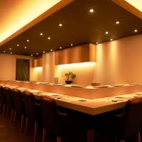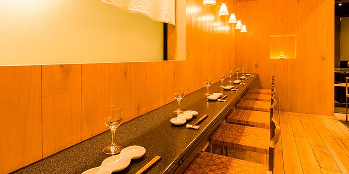 繁華街の喧騒から離れた場所とあって、店内にも落ち着いた雰囲気が漂います。長さ7mの直線的なカウンターを活かし、装飾を極限まで控えモダンなデザインに仕上げた空間。座り心地を追求した手作りの椅子と共に寛ぎの時間を紡ぎ出します。テーブルはご利用人数に併せて最適な場所へ。最大8名様までご利用いただけます。少人数様でのご利用はもちろん、各種ご宴会や親しい方との集まりなどにもお薦めのお席です。プライベート感ある落ち着いた大人の雰囲気の中、心行くまで自慢の料理とお酒をお愉しみ下さい。