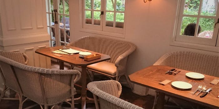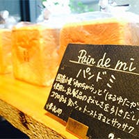 新緑のシーズンになると緑生い茂る、森の中にあるお店のような外観になります。店内は扉を開け、パンの香りに包まれてください。まるでフランスのパン屋さんに来ているかのようなディスプレイ。奥に行くと中はビストロになっています。フランスの食堂をイメージした店内は、学校の椅子やテーブルをアンティークのものでまとめました。元々は昭和初期の頃からある卸問屋を改装した店内の天井には当時のままの木が使われています。