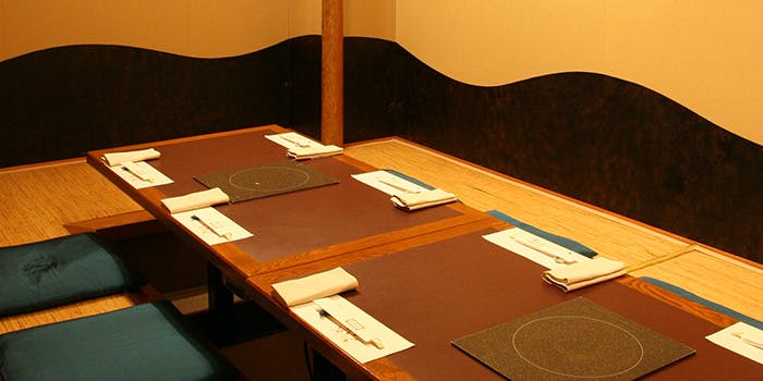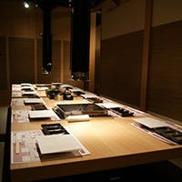 漆の木材が重厚感のある落ち着いた店内は大人の隠れ家のような密やかさのある空間です。カウンター席にテーブル席と個室がございます。それぞれのお部屋に持ち味のある個室を多彩にご用意しておりますので、ご接待やお食事会などシーンにあわせてご利用ください。ご希望の人数やご利用目的をお伝えいただければ、こちらで最適な空間をご用意させていただきます。お一人様もご歓迎いたします。