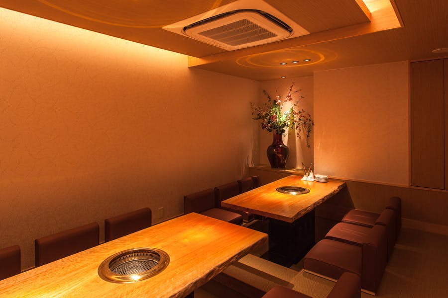 お部屋には鹿児島の地名の名前が付けられており、エントランスには雄大な桜島画がお出迎えいたします。全室個室のため、小さなお子様連れでも安心してご利用いただけます。排煙設備も完備しておりまして、煙やにおいを気にせず焼肉を楽しめるのも魅力。ゆっくりと寛ぐことができる掘りごたつタイプのお部屋。靴を脱ぎたくない方にはテーブル席もご用意しております。最大26名様まで対応可能ですので、デートや、友人との集まり、会社宴会など幅広くご利用ください。