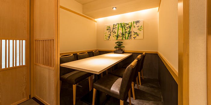 重厚な木戸を開けて進めば、そこは美しい和モダンの空間。規則を保ちながら縦横に交差する木柱の間から差し込むぬくもりある美しい光。和の格式とモダンの先進性が同居する空間に包まれて、お食事を楽しむことができます。一角には新宿にいることを忘れる四季の小道を臨む窓際のお席や、よりプライベートな雰囲気の個室席もご用意しております。光、木、竹などの自然素材それぞれのコントラストが空間に奥行きのある美しい立体感をもたらしております。 和の風情ただよう空間の美しさにほれぼれとしていただけるのではないでしょうか。