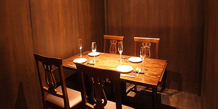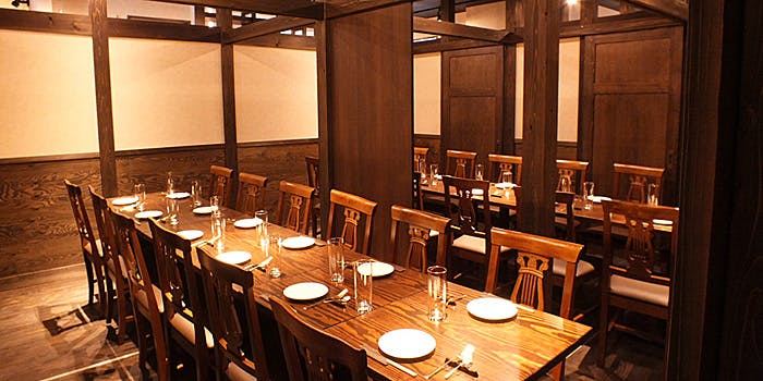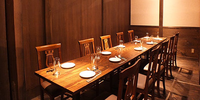 フランス料理を提供するビストロでありながら、所々に備長炭や和紙、金箔といった和の要素を取り入れていて、木のぬくもりや柔らかさ、温かさも感じることができます。新宿駅から徒歩数分という都会の中にいるのを忘れるかのような隠れ家のような店内になっています。個室もウッドブラウンの温かみのある部屋になっておりますので、大切な方とごゆっくりと美味しいお料理をお愉しみください。