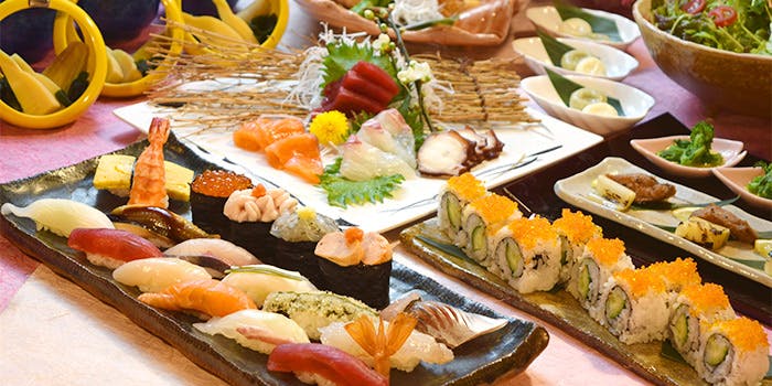 【土曜日限定価格】3時間飲み放題 料理長厳選の旬食材の小鉢3点・刺身盛合せ・本日の握り鮨など全8品