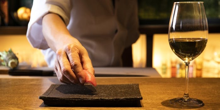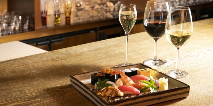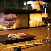 17時から21時(LO)まで、本格的な江戸前鮨をご用意しております。お好みのワインや日本酒に贅沢な江戸前鮨を合わせてお楽しみください。深夜メニューでは、特製の牛丼やビーフシチューなどのご用意もございます。はなれのメニューでも生ハムやチーズなども充実しておりますので、食後にもご利用ください。