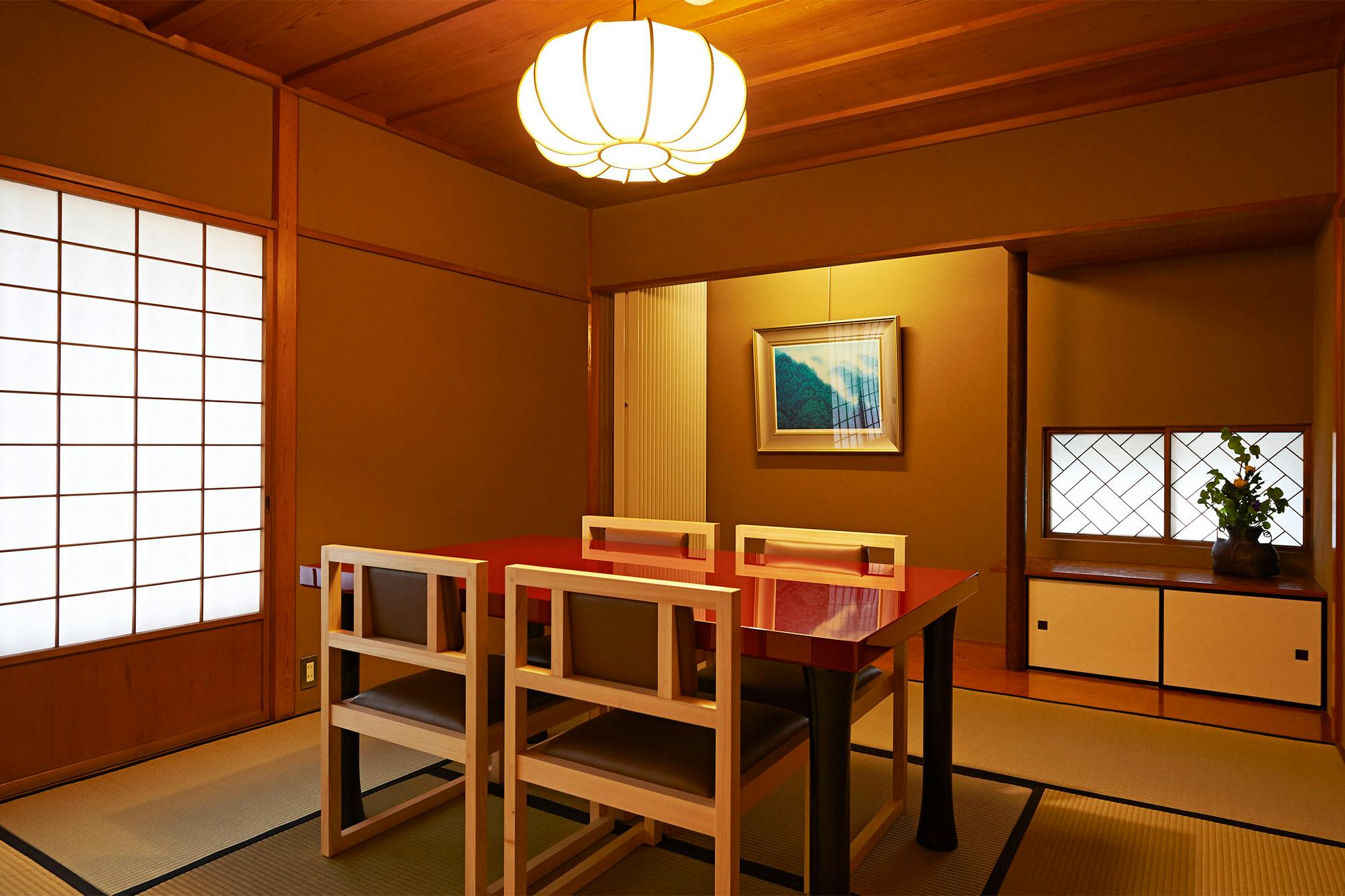 日本建築の第一人者、故・村野藤吾先生の設計による傑作。緑に抱かれる数寄屋造りの瀟洒な建物内は、和紙張りの光天井に金糸銀糸を織り込んだ水衣の襖が印象深い「花桐」、風雅な曲線の洞床に杉の一枚板を使った格天井が特徴の「葵」、洞床を背に座ると窓越しに庭の景が奥深く映える「紫」、竿縁天井からこぼれる光と雪見障子から覗く竹林がモダンな日本情緒を醸し出す「茜」、どのお部屋も趣深く、大切なお食事のお席にふさわしい設えとなっております。