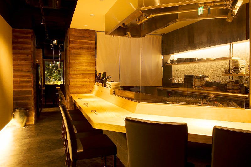 入口は、存在感のある「古民家の蔵戸」。「白木」のカウンターは、鉄板とで焼かれる食材を目の前で楽しめるお席となっております。ライトアップされた小さい箱庭を背景としたテーブル席や、大切な方とのご会食にも対応できる4名様個室もございます。 店内は、シンプルな空間構成で、温かみのある素材をあしらった落ち着ける「和モダン」の空間に仕上げました。