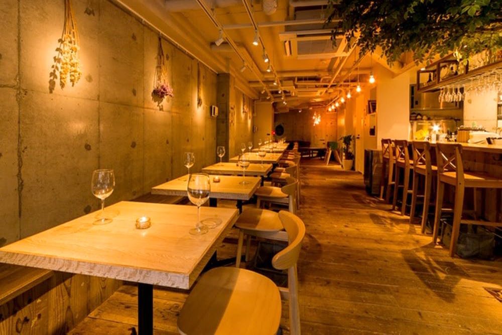 築60年の建物の梁や柱をそのまま生かした、本場イタリアを彷彿させるシックで落ち着いた雰囲気の店内。異国情緒あふれるハイセンスな空間はまるでイタリア本土を旅しているかのよう。天然一枚板を使用したカウンター席は、大人の落ち着いた雰囲気の漂う空間。様々なワインをグラスで愉しみたい方にお勧めです。ワイン一杯からでも気軽にご利用いただける、高級すぎずラフ過ぎないカジュアルな空間。気心知れた仲間と、ゆったりとしたお時間をお過ごしください。