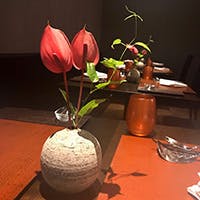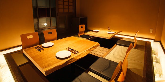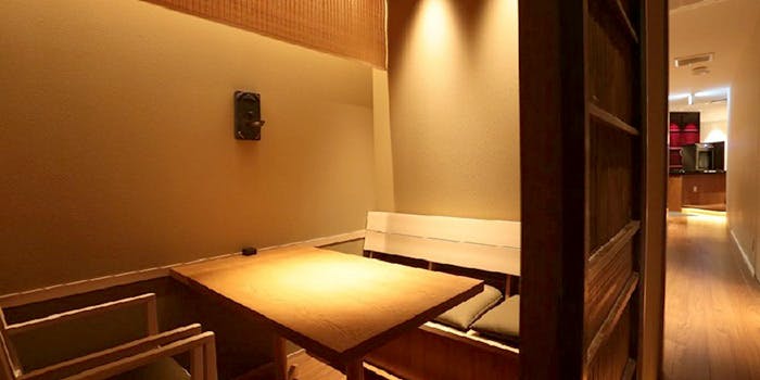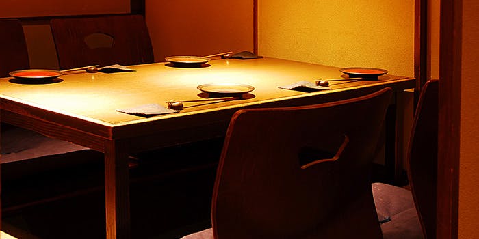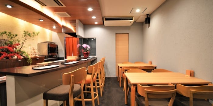 ガラス戸を開けると洗練されつつも木のぬくもりを感じる落ち着いた空間が広がります。テーブル席のほか、2名様から最大5名様までご利用いただける完全個室も2室設けられています。切り離されたプライベート空間は、接待や会食などにもおすすめです。周りを気にせずに、心ゆくまでお楽しみいただけます。また、テーブル席7名様から15名様の貸切も可能です。