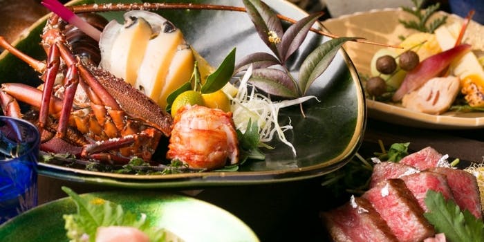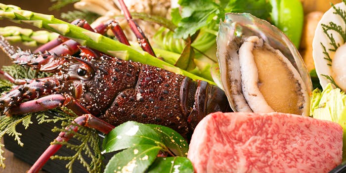 熟成黒毛和牛サーロインステーキに伊勢海老1尾、鮑1枚、中トロ入鮮魚盛りと素材にもこだわり、職人が腕を振るい正に極上の料理へと創り上げます。ワンランク上のお料理を是非ご賞味くださいませ。 ディナー 11,500円