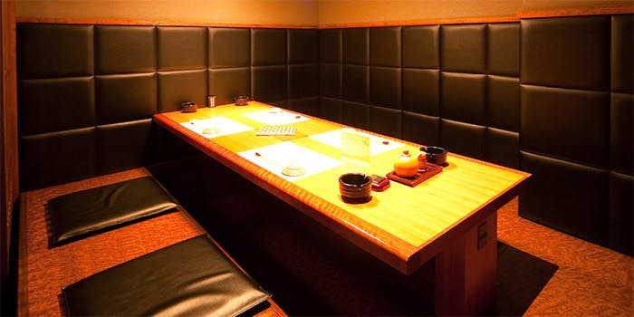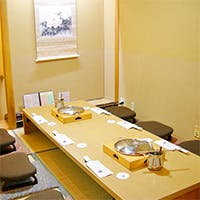 店内は、シックでモダンな空間となっております。カウンター席では、職人の技を目の前でお楽しみいただけます上質なお座敷ではゆったりした時間をお過ごしいただけます。少人数からご利用いただける個室と、最大16名様までご利用いただける個室のご用意もございます。記念日やご接待にご利用ください。