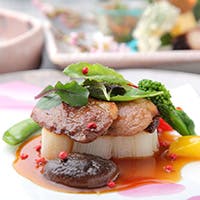テーブルを彩るのは無農薬・有機栽培の野菜やハーブ、食用花。生産者こだわりの海の幸やお肉などシェフ自ら生産者のもとに足を運び、日本全国・世界各地から選りすぐりの旬の食材でお客様をお待ちしております。また、苦手食材・アレルギー等のご相談もお気軽にご相談くださいませ。