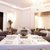 光輝くスワロフスキーのシャンデリアがかもしだすヨーロピアンモダンな空間に、カトラリーは1830年に創業したフランスのシルバーウェア “クリストフル”“マルシー”シリーズを添えて食卓の芸術を演出。 佐賀県の有田焼・照右ェ門窯、カマチ陶舗にて焼いていただいたオリジナルのアシェットやエリザベス女王の肖像画も手掛けたTYLEK画伯の絵画を眺めながらゴージャスな時間をお過ごしください。