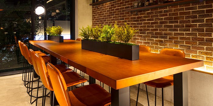 広々とした空間は、石と木がふんだんに使われたモダンな雰囲気をお愉しみいただけます。ゆったりと寛げるソファー席や、外の風に当たりながら快適に過ごせるテラス席もございます。自然と現代が調和された空間で楽しいひと時をお過ごしください。