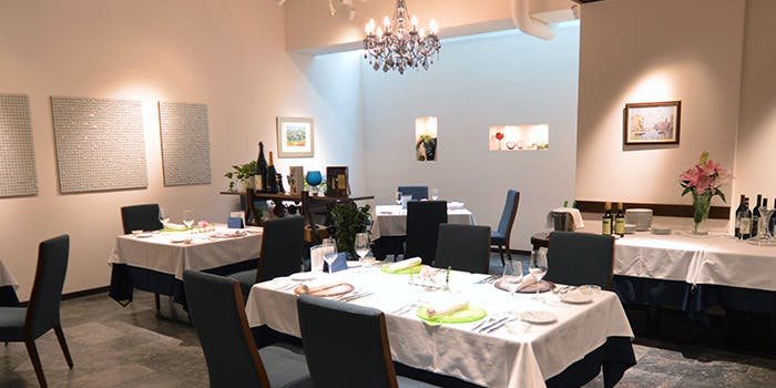 ダークブルーと白を基調としたシンプルシックなインテリア。大理石フロアとチーク材の天井。ひときわ目を引くモダンなシャンデリア下の奥の席は予約時に指名される方の多い人気席です。シンプルなインテリアに映える、カラフルなテーブルセッティング。テーブルフラワーと共に飾られているハーブはお好みでパン用オイルの香りづけに使える、この演出が大変人気です。地下とは思えないほど天井が高く開放的で明るく、ランチタイムには天窓から気持のよい陽が射しこみます。