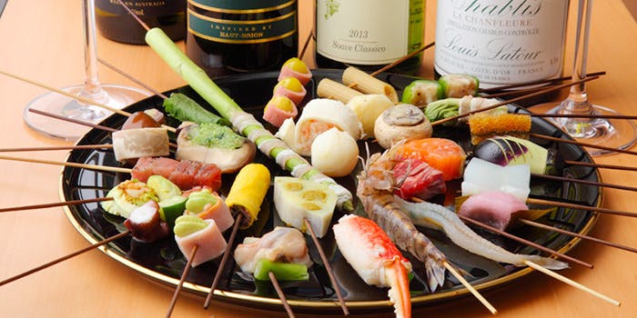 【フルボトルワイン付】定番活車海老から、カニの身と錦糸卵、豚ヒレ肉など創作串20本とワインとの調和を
