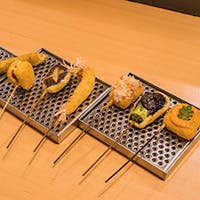■定番から少し変わった物まで、創作串揚げ20品をご堪能下さい! 神戸亭では、四季ごとに旬の素材を取り入れた、串のコース料理をお出ししています。 繊細な串料理を十分に楽しんでいただくには、やはり揚げたてが一番。お席もカウンターのみとなっております。 当店の主役たちが最もその個性を最大限に引き出せるよう、キメ細かい自家製パン粉と最高品質の油で薄く揚げており、創意工夫を重ねたマスター自慢のオリジナルソースで、お召し上がりいただきます。 ディナー 5,600円
