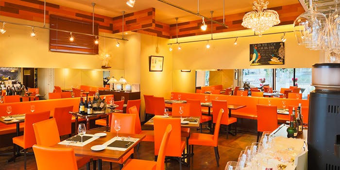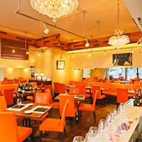 お店のあちこちに置かれたブタの置物や絵。ヨーロッパにおいて「ブタは幸福を呼ぶ」と言われてます。そんな豚を、好きなオレンジ色にして当店のロゴの一部にもにも使わせてもらってます。白、オレンジ、こげ茶を貴重とした店内は、肩肘張らずにゆったりとお過ごし頂ける開放的な空間。カウンター席10席、テーブル席16席、テラス席4席とシーンに合わせてお好きな席でお寛ぎ下さい。