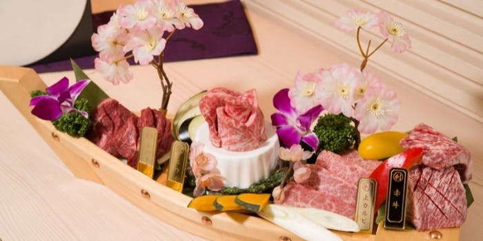 神戸牛をはじめとする、さまざまな国産牛が味わえる神戸牛焼肉 利休。 仕入れにはとことんこだわっていて、神戸牛を格付けできる専門家の指導の下、各地の農場を訪れ、会話のなかからその時々の最高の牛肉を買い付けています。おいしい肉と合わせたいワインや日本酒も豊富に取り寄せていて、マリアージュを存分に楽しむことができます。 ディナー 7,700円