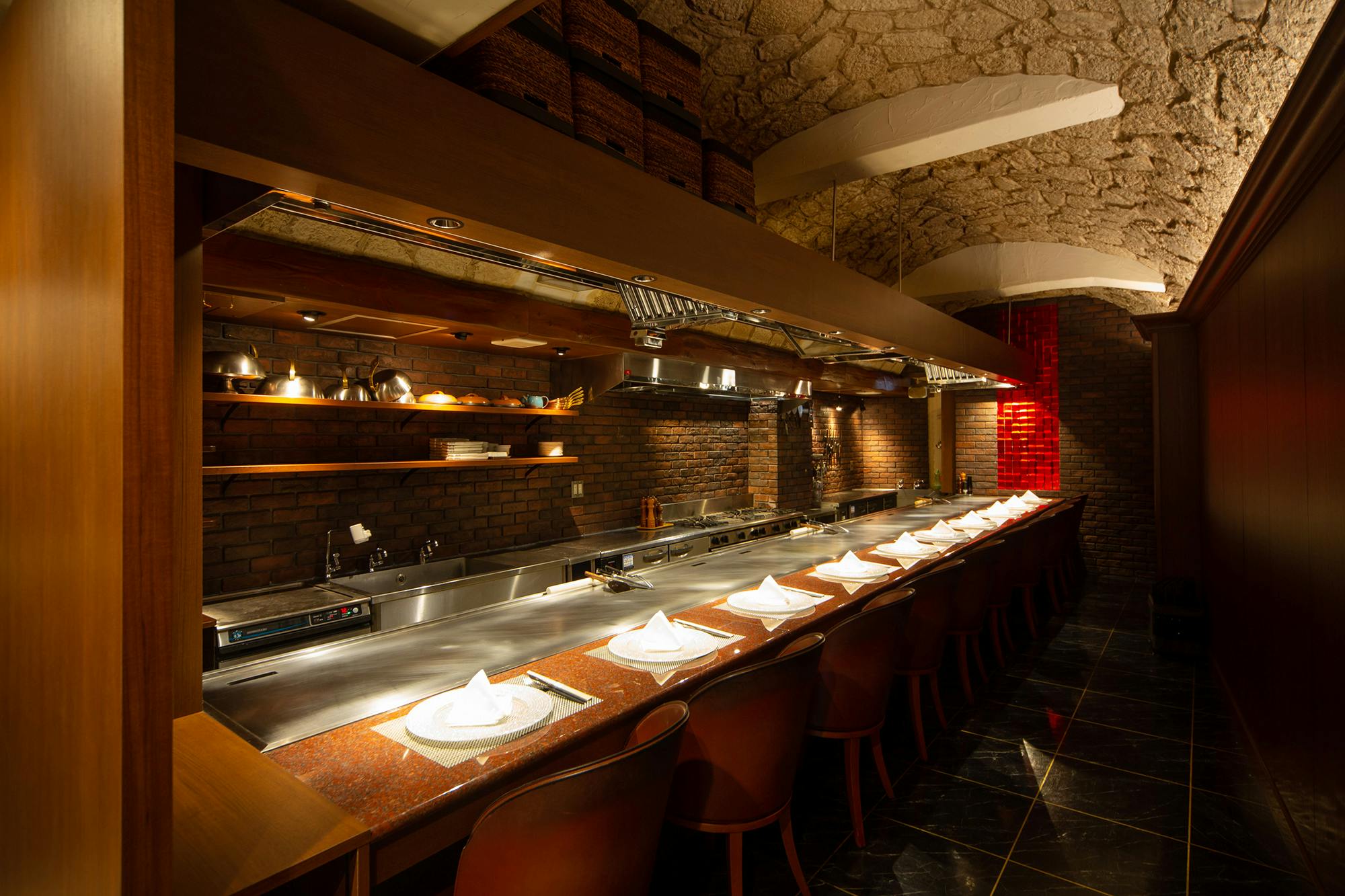 ヨーロッパのワイン貯蔵庫をイメージした店内は、12名まで座って頂ける大鉄板のカウンター席ではおひとり様やデートにおすすめ。接待や記念日には4名様のテーブルが2卓ご用意ございます。定休日の貸し切りは6名様より承りますので、どうぞお気軽にご相談ください。