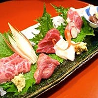 食の醍醐味は旬の食材の良さを最大限に活かされた料理を楽しくいただくことでございます。日本全国から取り寄せた旬の厳選食材を使用した逸品の数々は目でも舌でもお愉しみいただけるよう、ご提供いたします。 例えば、当店自慢の熊本より吟味された極上の本物の馬刺しを召し上がって頂けます。低カロリー、高たんぱくで健康にも良い 臭みも全くない美味しい馬刺しを珍しい部位も含めご堪能下さいませ。コース料理に含まれておりますが、お嫌いであれば食材を変更させて頂きます。
