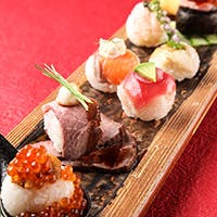 新鮮なネタをてまり寿司でご提供いたします。一口サイズで女性に人気。ちょっと変わった「華てまり」など種類も豊富。いろいろなてまり寿司をお楽しみください。