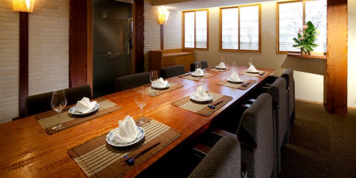 重厚な木戸を開けて進めば、そこは美しい和モダンの空間。規則を保ちながら縦横に交差する木柱の間から差し込むぬくもりある美しい光。和の格式とモダンの先進性が同居する空間に包まれて、お食事を楽しむことができます。一角には新宿にいることを忘れる四季の小道を臨む窓際のお席や、よりプライベートな雰囲気の個室席もご用意しております。光、木、竹などの自然素材それぞれのコントラストが空間に奥行きのある美しい立体感をもたらしております。 和の風情ただよう空間の美しさにほれぼれとしていただけるのではないでしょうか。