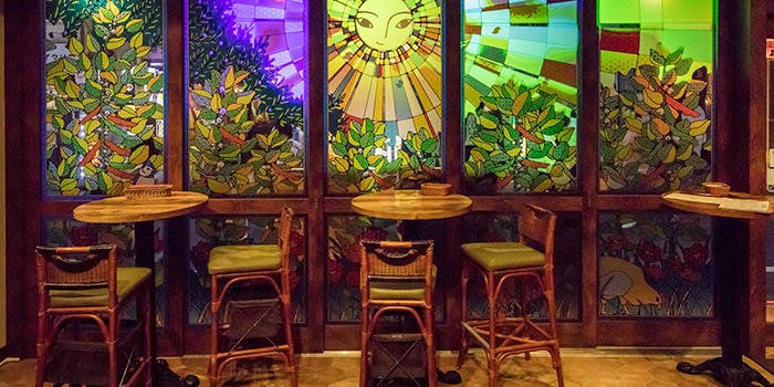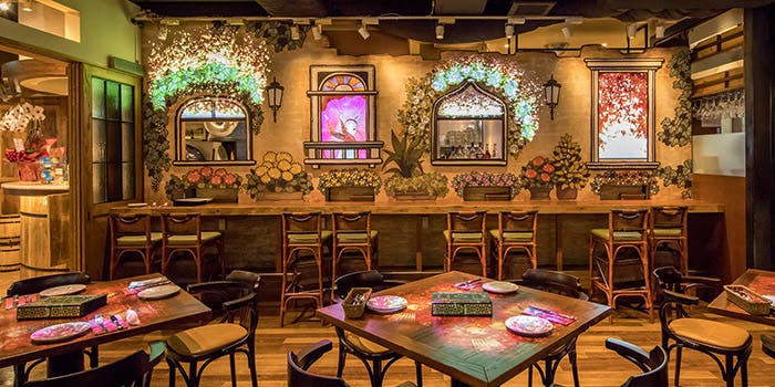 歌舞伎町一番街に一際目立つ「太陽神」マッピングのテラスがお出迎え。店内はトラディショナルな本格レストラン仕様。テラスゾーンはハイテーブル、カウンターはおひとり様から、中央ホールはダイニングテーブルゾーン、奥のソファーゾーンはパーティーシーンや記念日使いに最適。お食事をしっかり楽しめる空間となっております。更に、各所に配置された最新のプロジェクションマッピングはお食事を邪魔しない「非日常」を演出。コラボメニューによる「特別マッピング」や突然始まる「イベントマッピング」など、様々な変化や驚きを是非。