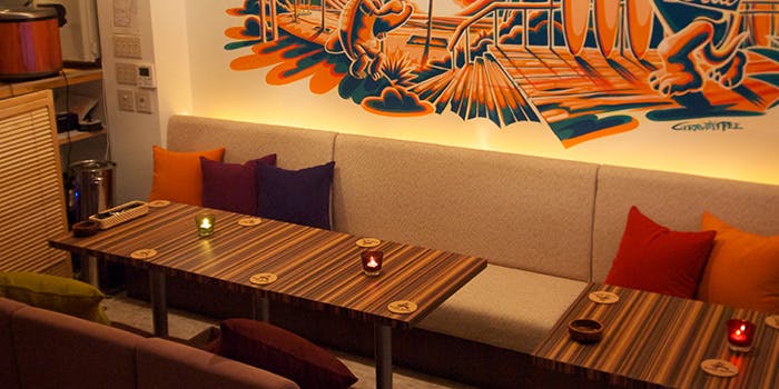 新宿歌舞伎町のアパホテル2階。アイヌ文様をモチーフにした印象的な看板でお出迎え。木目調の温かみのある落ち着いた雰囲気の中にカラフルなイスがおしゃれに並ぶ店内は新宿の喧騒を忘れさせてくれます。5〜10名様と10〜20名様のカーテン仕切りの半個室を2つご用意。さまざまな用途に合せてご利用頂けます。着席は最大60名様、立食100名様までご利用可能で最少40名様より貸切も承っております。