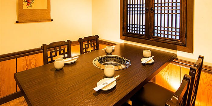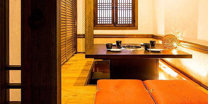店内へと誘う小道を進み、重厚な扉を抜けると、そこに広がるのは街の喧騒から逸脱した空間。立派な梁と格式ある内装の一軒家で過ごす時間はまるで韓国に来たかのような錯覚に陥ります。接待や商談にもお使いいただけるような優美な個室もご用意しております。2名様〜30名様まで、様々なご宴会にご活用ください。
