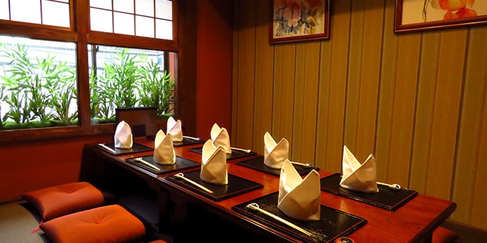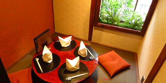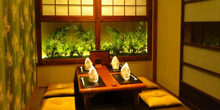 重厚な木戸を開けて進めば、そこは美しい和モダンの空間。規則を保ちながら縦横に交差する木柱の間から差し込むぬくもりある美しい光。和の格式とモダンの先進性が同居する空間に包まれて、お食事を楽しむことができます。一角には新宿にいることを忘れる四季の小道を臨む窓際のお席や、よりプライベートな雰囲気の個室席もご用意しております。光、木、竹などの自然素材それぞれのコントラストが空間に奥行きのある美しい立体感をもたらしております。 和の風情ただよう空間の美しさにほれぼれとしていただけるのではないでしょうか。