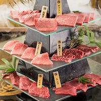 富士門は渋谷区保健所より【認定生食用食肉取扱者等設置施設】として受理され、「和牛ユッケ」や「和牛刺し」などの生肉を安心してお楽しみ頂けます。 芝浦食肉市場直送の国産黒毛和牛、鮮度抜群ホルモンや、「御来光すきやき」や「富士山頂盛り」などインパクト抜群のメニューもご用意しております。 シックな雰囲気の中で、デートや女子会、会社宴会やかしこまった会食の場など、様々なシーンにご利用ください。 ディナー 5,000円