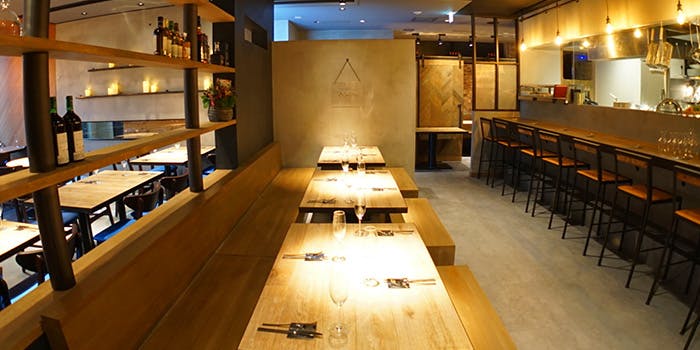 店内は地下とは思えない開放感ある明るい、木の温かみが感じられるシンプルなデザインの空間となっております。お席はオープンキッチンを囲むようにレイアウト。同フロアには日本の伝統美を併せ持つモダンなワインバーを完備しており、お一人様でのご利用やお待ち合わせにもお気軽にご利用いただけます。