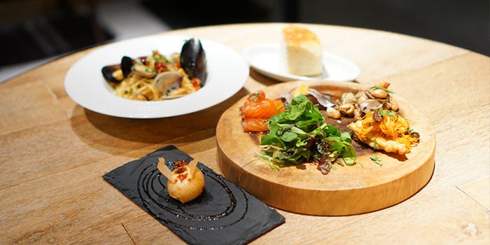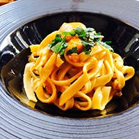 国内で地中海気候に最も近い淡路島より取り寄せた生パスタを使用しています。もっちりとした食感が自慢の逸品です。他にも、イタリア各地で修業を重ねたシェフが新鮮食材を日替わりでご用意するバリエーション豊かな小皿のお料理を添えて選りすぐりのシャンパンやワインとともにどうぞ。程よい活気にお話も弾んでしまいそうです。