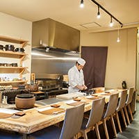 繁華街の喧騒から離れた場所とあって、店内にも落ち着いた雰囲気が漂います。長さ7mの直線的なカウンターを活かし、装飾を極限まで控えモダンなデザインに仕上げた空間。座り心地を追求した手作りの椅子と共に寛ぎの時間を紡ぎ出します。テーブルはご利用人数に併せて最適な場所へ。最大8名様までご利用いただけます。少人数様でのご利用はもちろん、各種ご宴会や親しい方との集まりなどにもお薦めのお席です。プライベート感ある落ち着いた大人の雰囲気の中、心行くまで自慢の料理とお酒をお愉しみ下さい。