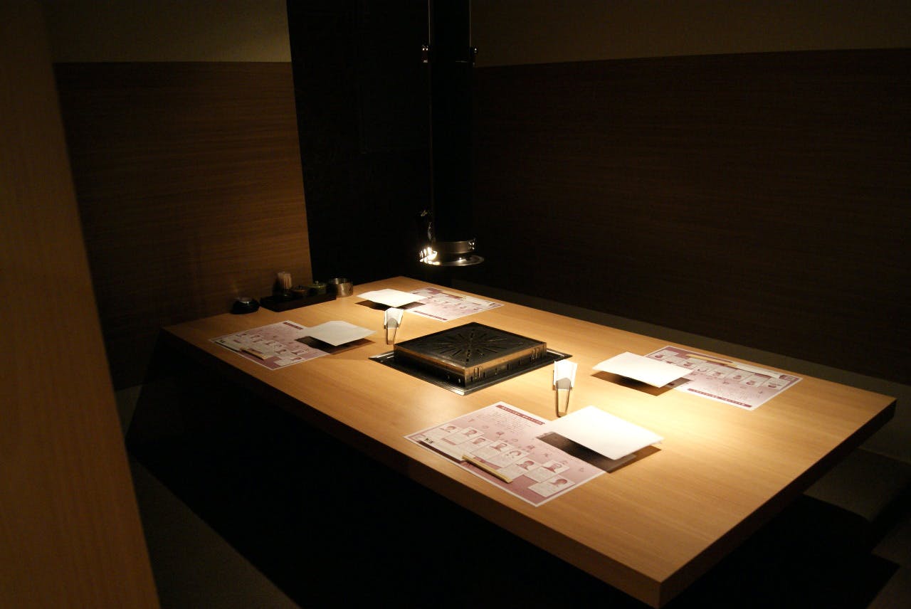 お部屋には鹿児島の地名の名前が付けられており、エントランスには雄大な桜島画がお出迎えいたします。全室個室のため、小さなお子様連れでも安心してご利用いただけます。排煙設備も完備しておりまして、煙やにおいを気にせず焼肉を楽しめるのも魅力。ゆっくりと寛ぐことができる掘りごたつタイプのお部屋。靴を脱ぎたくない方にはテーブル席もご用意しております。最大26名様まで対応可能ですので、デートや、友人との集まり、会社宴会など幅広くご利用ください。
